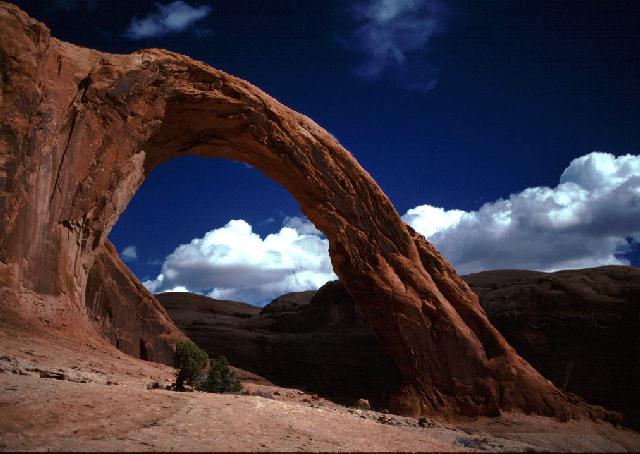 NABSQNO 12S-620207-4271054. Corona Arch is an old buttress natural arch eroded through a projecting wall of Navajo sandstone. The opening is a half-semicircular aperture (pie quarter shaped). It is considered old because weathering and compression strengthening have sculpted the lintel into a graceful half-catenary shape.