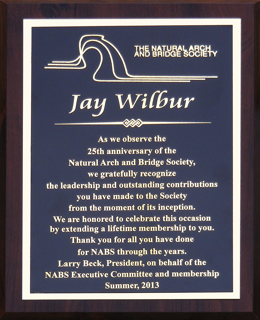 The plaque was presented to Jay (left) at Crow Canyon Arch, New Mexico, by NABS President Larry Beck. Exhibit 9 provides a readable view of the plaque.