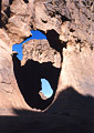 ALG-333, Woodpecker Rock Arch, Tissoukai Area Islet Four. 3.1 meter height (measured). From ALG-242 (Elqablet Arch) walk 300 meters east near the rim of Idou Canyon. Find in this area the beautiful Woodpecker Rock (an unusually fine balanced rock and good landmark). The arch is located 100 meters west of this rock. On the photo half of the opening is shielded by the dark wall behind it. See Map 12. |