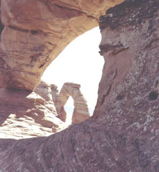 Delicate Arch (qv) sits on the rim of a basin. This little arch sits on the opposite rim of the basin. In this photo, Delicate Arch is visible through Frame. The arch is on the right very near the end of the trail to Delicate.